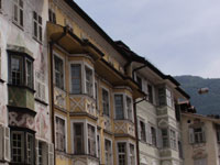 ボルツァーノはドロミテ渓谷への入り口。オーストラリアの国境から約50qの位置にあり、チロルの面影が残るという。ドイツの影響が強く残っているため、ドイツ語とイタリア語が使われている。 昼食の後、メイン通りのポルティチ通りを歩くと15〜18世紀の三角形や円形の出窓のついた建物が中世の面影を残していた。 ヴァルテル広場にある大聖堂は屋根に模様がついていた。鐘楼は1595年のもの。 | |
